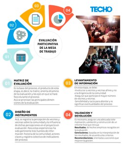 Para TECHO es de vital importancia evaluar el trabajo realizado, para conocer las fortalezas e identificar oportunidades de mejora que permitan capturar aprendizajes y realizar cada día un trabajo más transparente. La información es clave para la organización, en tanto facilita la toma de decisiones basada en evidencias para contribuir a la transformación social.