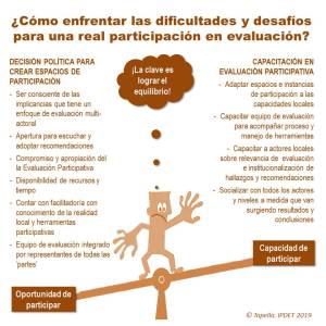 En cuanto a la oportunidad de participar, la experiencia me indica que no todas las instituciones/programas que convocan a una evaluación participativa están realmente dispuestas a facilitar y acompañar estos procesos. Entre las principales retos, me gustaría destacar aquellos que siento más relevantes: