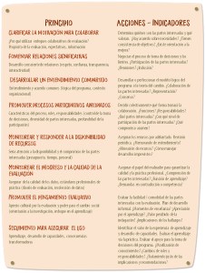 Para guiar la toma de decisiones y la aplicación práctica de los CAEs, desarrollamos y validamos sistemáticamente un conjunto de principios generales que cubren a todos los miembros de esta familia de enfoques colaborativos. Estos principios se aplican de manera más útil cuando son tomados en su conjunto (a diferencia de la simple selección de ellos como si fuera un menú), están interconectados y siguen una secuencia temporal flexible. Los principios y las preguntas prácticas sugeridas asociadas con cada uno se presentan a continuación.