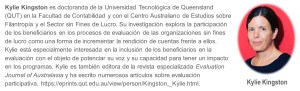 Los resultados de mi investigación para la maestría revelaron que los beneficiarios ciertamente desean participar en la evaluación de los programas que ofrecen las organizaciones sin fines de lucro a las que acceden. Sin embargo, es importante hacer coincidir la forma en que los beneficiarios participan en la organización (con relación a los programas que utilizan y la oportunidad de su participación) con el enfoque y los procesos evaluativos. Para mayores detalles acerca de estos hallazgos y criterios de evaluación participativa, se pueden consultar las siguientes dos publicaciones especializadas, que aparecieron luego de la referida investigación: Kingston, Furneaux, De Zwaan y Alderman (2020a y 2020b). Para profundizar en estos hallazgos, la investigación para el doctorado en la que estoy inmersa actualmente busca desarrollar una mayor comprensión de la evaluación participativa desde el punto de vista de los beneficiarios.
