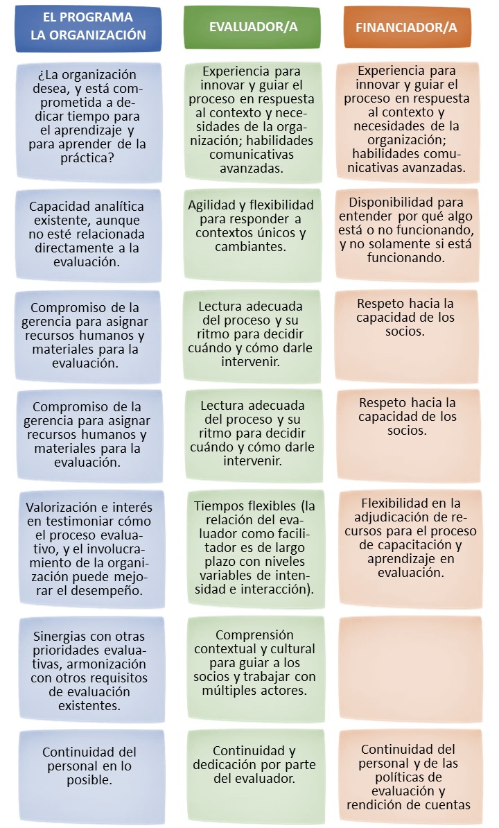 En resumen, la ‘disposición’ requiere atención desde un inicio de parte de la organización o proyecto, el evaluador y el ente financiador. Si no existe un alto nivel de disposición, el potencial de enfoques participativos de evaluación como la EOU será limitado, sobre todo si el financiador presume ser el único usuario con interés exclusivamente sobre documentar impactos al final de un proyecto.