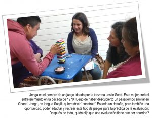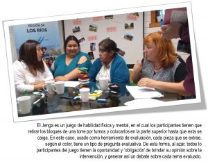 En concreto, durante la planificación del taller el consejo evaluador comunal puso mucho hincapié en generar una herramienta lúdica, entretenida y didáctica. De esta manera se adaptó un popular juego conocido como “Jenga” y se agregaron preguntas a las piezas de manera tal que los y las participantes fueran contestando las preguntas ideadas por el consejo a medida que iban sacando las piezas de la jenga. Si bien el juego fue un acierto, el lenguaje utilizado en las preguntas fue en algunos casos de difícil comprensión para los participantes.