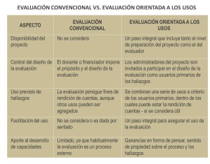 La recolección de datos, el análisis de los mismos y le preparación de informes quedan a cargo del evaluador, aunque siempre hay una validación con los usuarios primarios. Por lo tanto se puede decir que en el caso de DECI la implementación de le evaluación es colaborativa. Estos diferentes niveles de participación a lo largo del proceso de evaluación invitan a la reflexión sobre qué constituye evaluación participativa y qué no. Lo que está claro es que la evaluación orientada a los usos contrasta de forma significativa con la evaluación convencional, como vemos en la siguiente tabla.