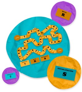 El tablero ilustra un laberinto con distintos campos donde las y los participantes, por medio de turnos, pueden avanzar para ir respondiendo y discutiendo en torno a preguntas, afirmaciones, retos, etc.