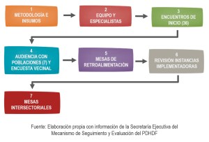 Con esta base, se redactaron las primeras versiones de cada uno de los 30 capítulos del Diagnóstico y Programa 2016, mismas que fueron socializadas en mesas de retroalimentación donde participó el conjunto de actores convocados para los encuentros de inicio, con la finalidad de contar con su valoración y retroalimentación sobre lo recuperado y expuesto en el diagnóstico. Esto fue complementado con mesas de revisión donde solamente participaron las treinta instancias gubernamentales responsables de la ejecución posterior de las estrategias y acciones planteadas en el programa actualizado, para conocer -sobre todo- su viabilidad[7]. Por último, se llevaron a cabo mesas intersectoriales por cada derecho y grupo de población, con la participación de las instituciones gubernamentales, representantes de sociedad civil y el Comité de Seguimiento y Evaluación del PDHDF.